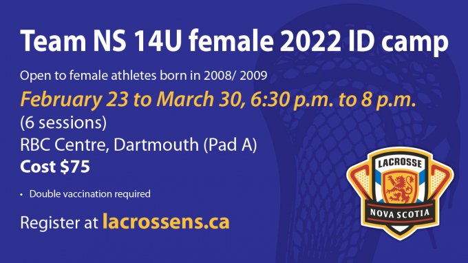 Click on this add to register for this program is an identification camp for the 14U Female Team NS team going to Lacrosse Canada National Championships in August 2022 in Langley, BC.Tryouts for this team will be held in April of 2022. This is a high performance opportunity for girls to get back on the floor and have some skills and drills development in preparation for tryouts. All players must be born in 2008 or 2009 to be age eligible. All players must be double vaccinated to comply with facility restrictions and public health restrictions. Masks must be worn indoors except on the floor with helmets on.