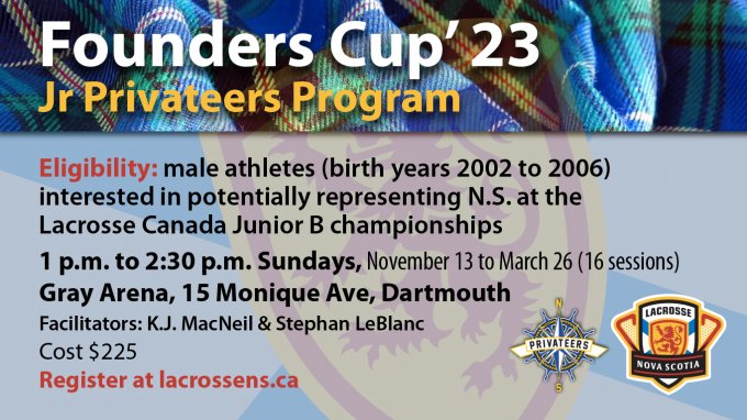 Lacrosse Nova Scotia is providing a high performance opportunity for age eligible male players who will turn 17-21 and play junior in 2023 (birth years 2002-2006). Stephan LeBlanc and KJ MacNeil will lead this program. READ MORE for registration details and link.Our intention is to be able to send a team to Founders Cup (Lacrosse Canada JR B National Championships) in 2023. Any questions, please contact KJ MacNeil-lacrossetechdirector@sportnovascotia.ca .