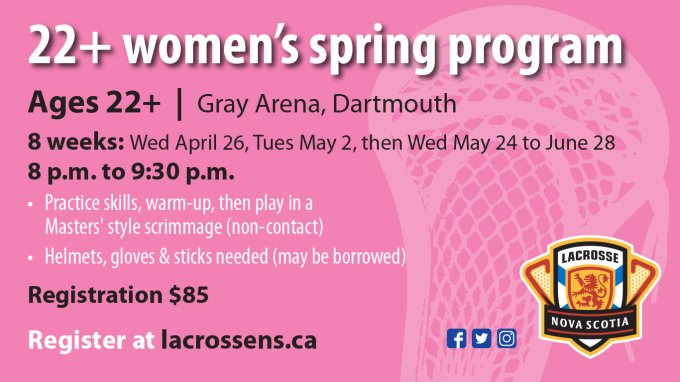We are offering an 8-week program starting April 26th and ending June 28th. The sessions are mainly on Wednesday nights, 8-9:30pm at the Gray Arena, 15 Monique Ave, in Dartmouth. READ MOREThe sessions will be on Wed April 26, Tues May 2, then Wed from May 24-Jun 28, all 8-9:30pm.The cost is $85. Each session will have some skills work for warm-up followed by ‘masters’ style game play (no stick or body contact). We can provide helmets, gloves and sticks, if required. If you have your own helmet, gloves and stick, that's great, too. All you need is comfortable clothing and running shoes. Please note: We need minimum 24 to run this program so spread the word!