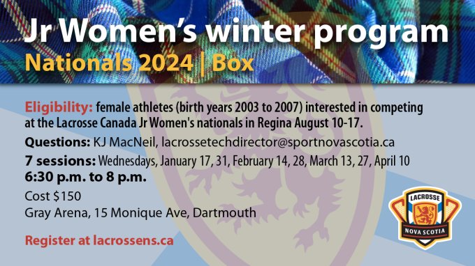 Lacrosse Nova Scotia is providing a high performance winter program for Jr aged women to keep sticks in hand and development going this off-season. READ MORE for details and registration link.Jr Womens Winter Program 2024